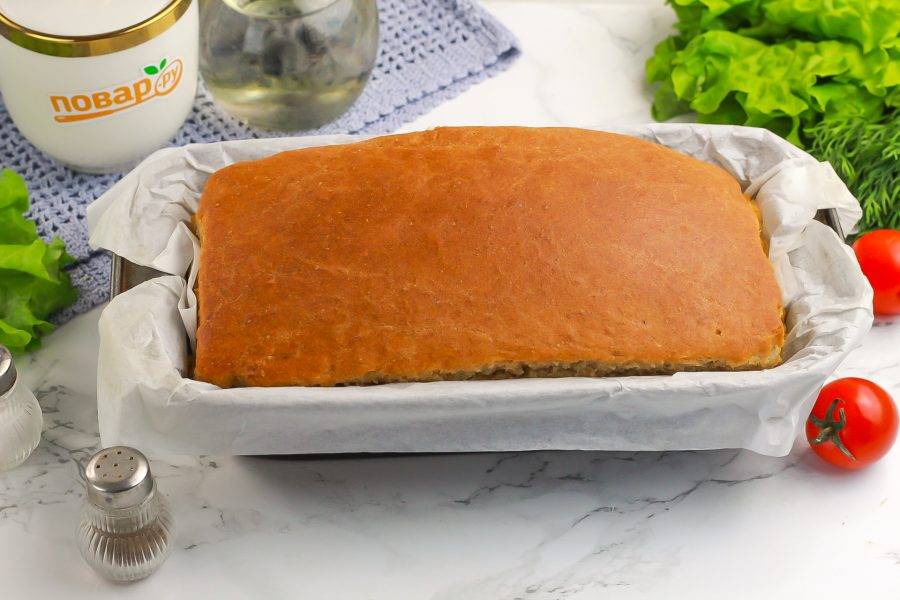 Застелите форму пергаментной бумагой и смажьте растительным маслом — это нужно сделать обязательно, иначе испекшийся хлеб будет тяжело извлечь из формы. Выложите в форму приготовленное тесто и накройте салфеткой. Дайте подняться в течение 1 часа при комнатной температуре.