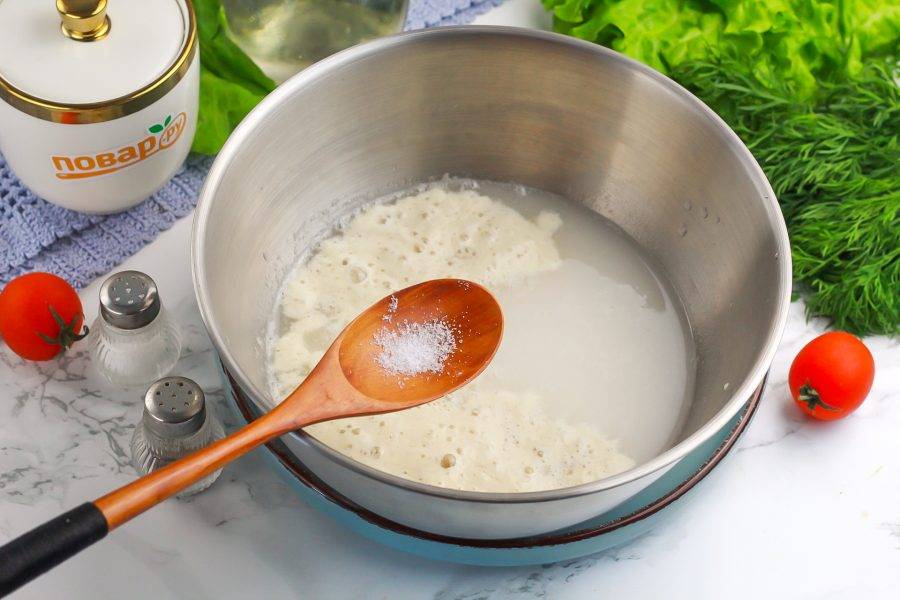 Когда поднявшаяся опара упадет, точнее — когда пузырьки все лопнут в ней, вмешайте растительное масло.