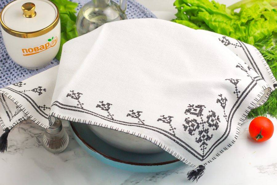 Накройте емкость полотенцем и оставьте при комнатной температуре примерно на 1-1,5 часа. Можно поместить в холодильник на ночь.