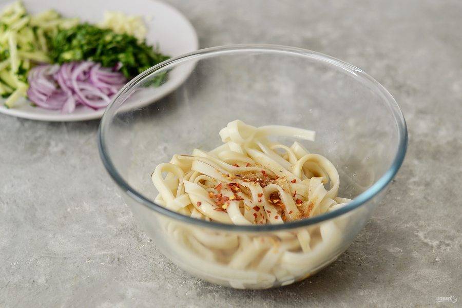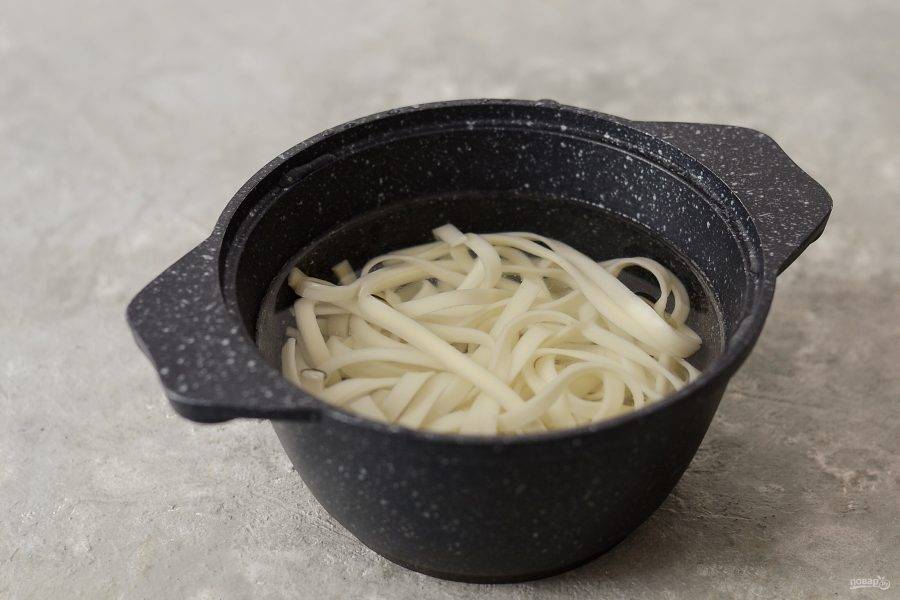 Лапшу отварите в кипящей воде до готовности. Затем переложите в холодную воду, чтобы она остыла. Откиньте на сито и подождите, пока стечет вода.