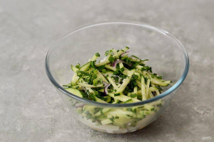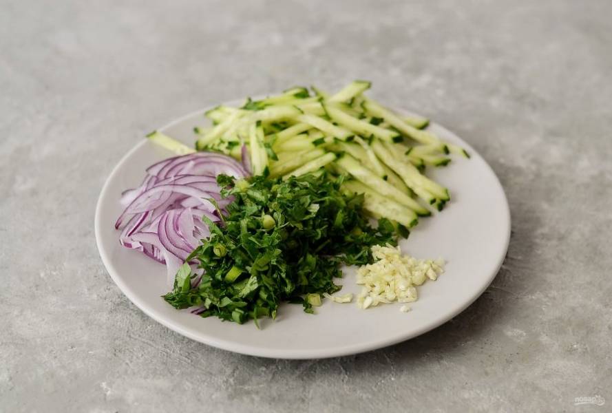 Зелень мелко нарежьте. Чеснок измельчите. Лук нарежьте тонкими перьями. Огурец нарежьте тонкой соломкой.