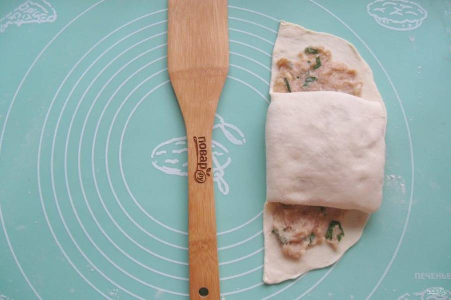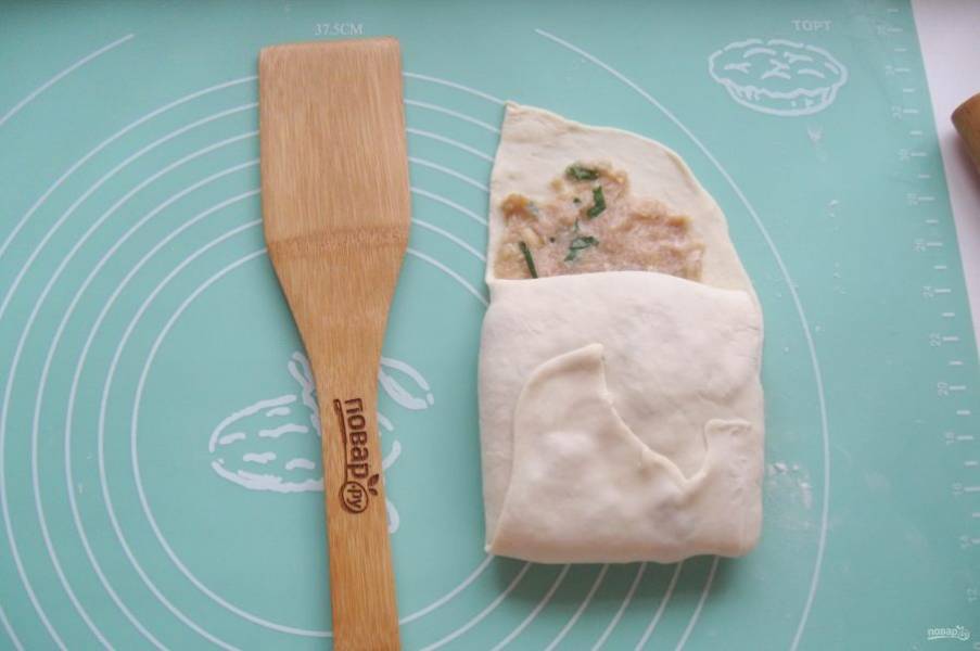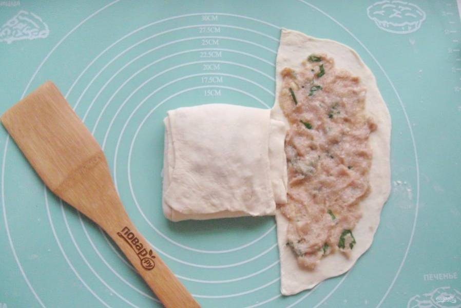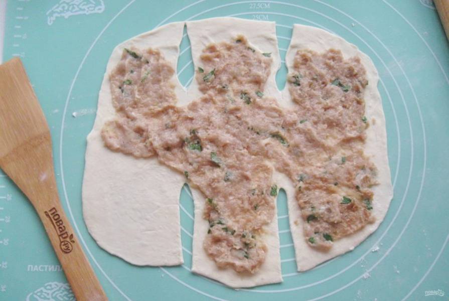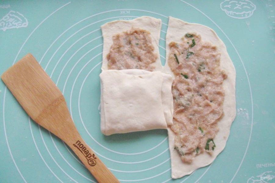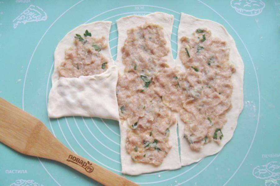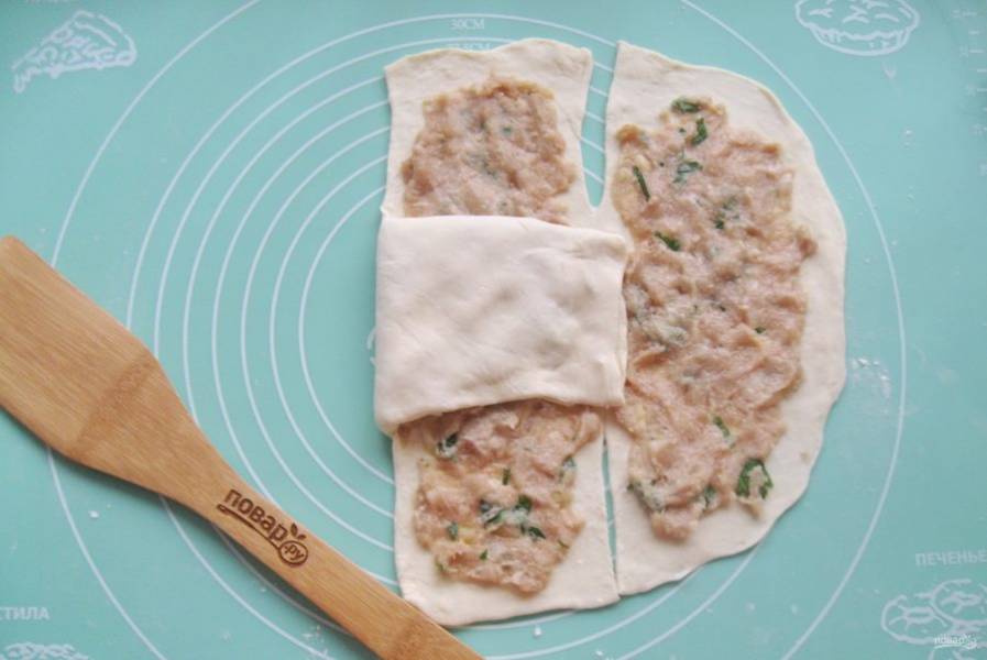 Выложите начинку на тесто ровным, не очень толстым слоем, оставляя один квадрат свободным. Выкладывайте фарш, оставляя допуски по полсантиметра вдоль разрезов и по периметру пласта.