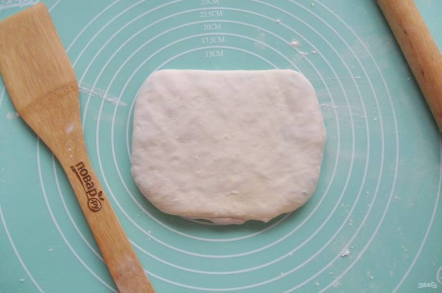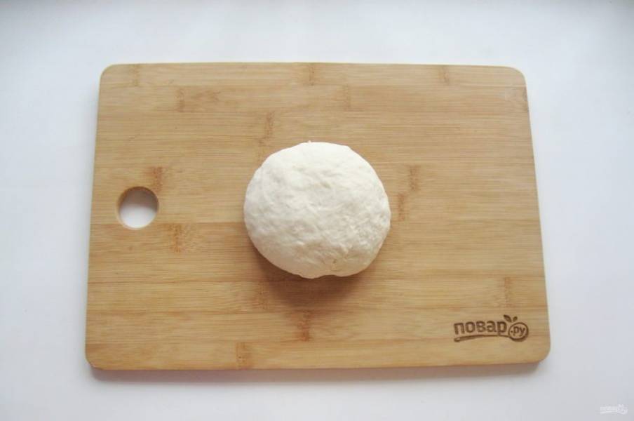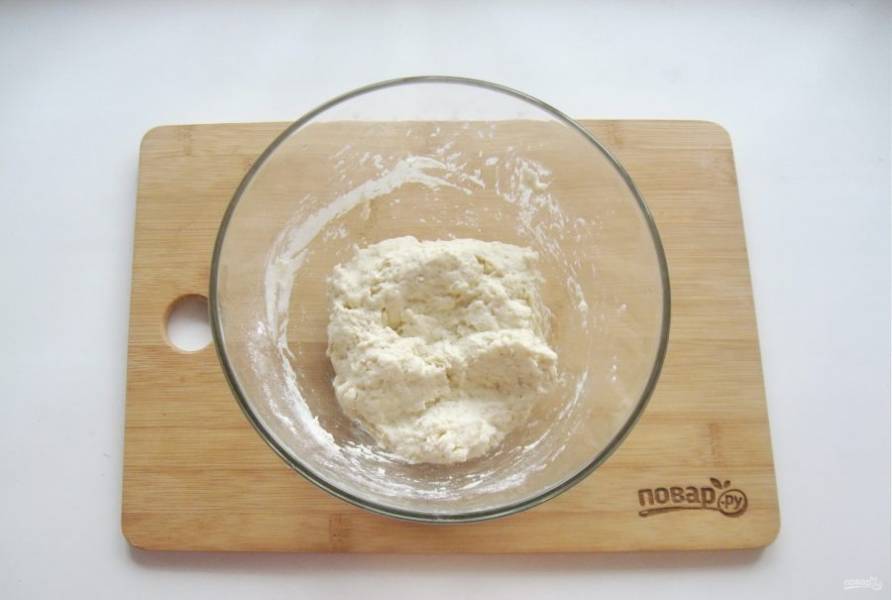 После достаньте тесто из миски и замесите не очень крутое, эластичное тесто.