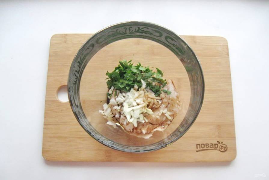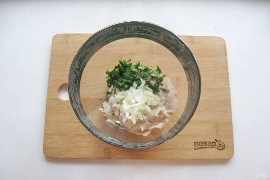 Приготовьте начинку для лепешек. В миску выложите любой мясной фарш. Добавьте нарезанную зелень или зеленый лук.