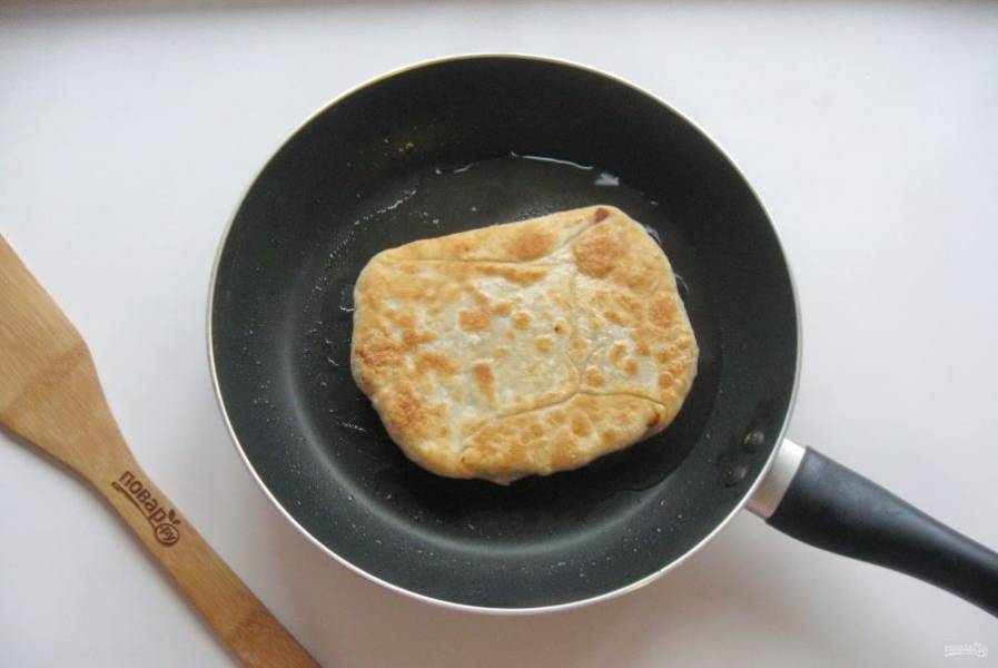 Обжарьте с другой стороны. После налейте немного воды в сковороду, накройте крышкой и пропарьте лепешку в течение 5-6 минут.