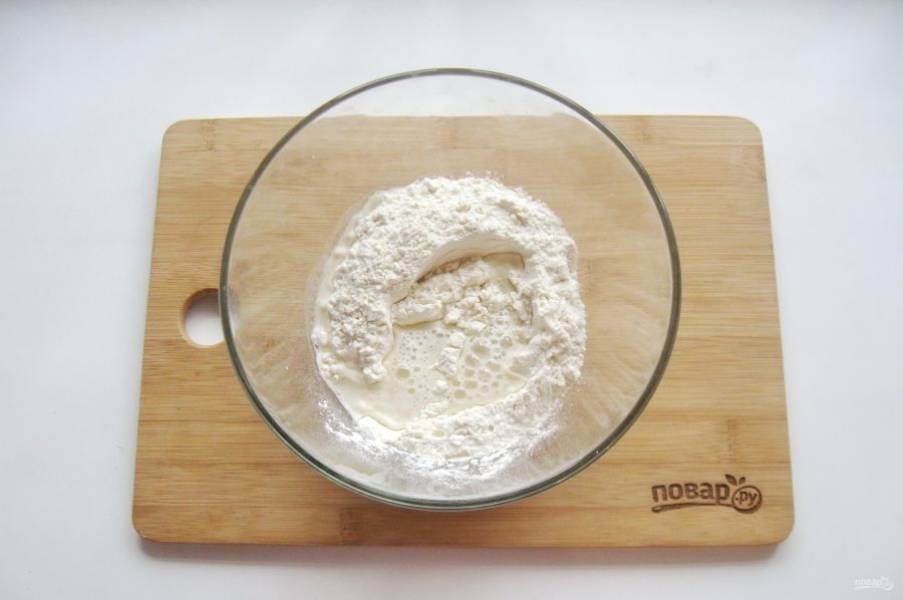 Сделайте тесто. В миску насыпьте муку и щепотку соли.