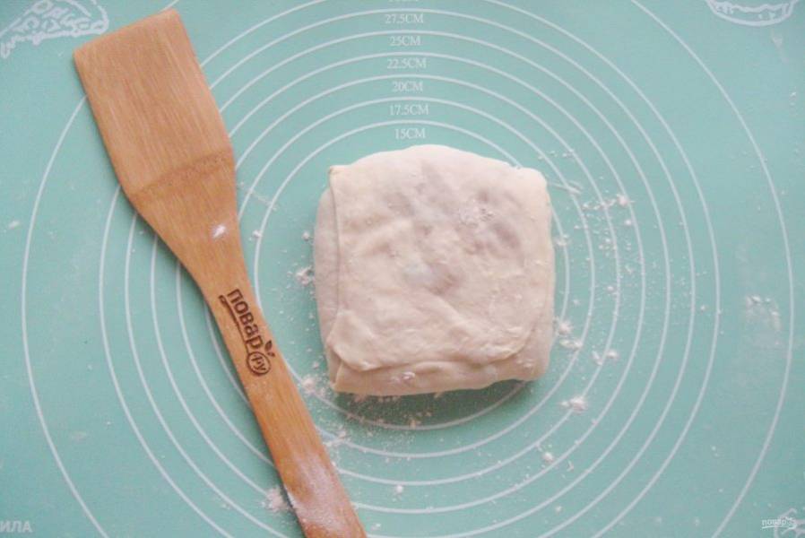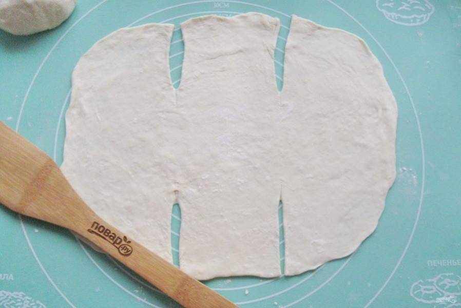 Разделите тесто на три части. Одну часть раскатайте, как можно тоньше, используя муку. Затем сделайте надрезы, разделяя пласт теста условно на 9 частей.