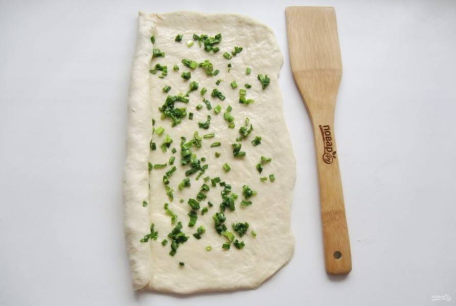 Зеленый лук мелко нарежьте и выложите на тесто.