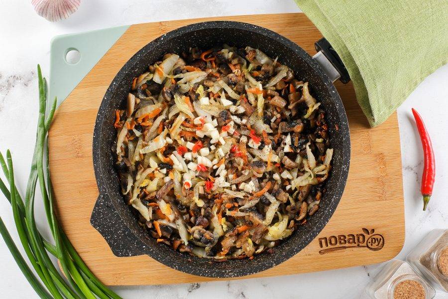 Готовьте ещё около 5 минут или до мягкости капусты. После чего добавьте молотый перец, нарезанный без семян перец чили и измельчённый чеснок.