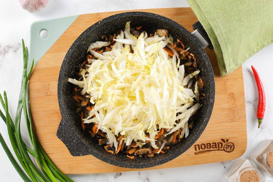 Добавьте нашинкованную капусту. У меня пекинская, но можете взять обычную белокочанную.