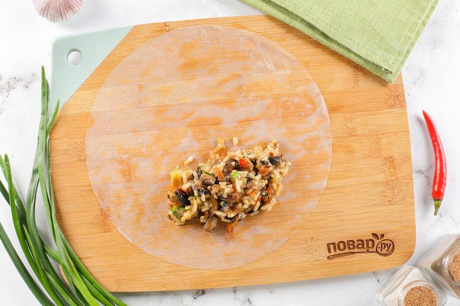 Рисовую бумагу опустите на несколько секунд в тёплую воду (смотрите инструкцию на упаковке) и когда лист станет мягкий, достаньте, стряхните излишки воды и выложите на нижнюю часть немного начинки. Готовить лучше всего по одному, так как рисовая бумага очень быстро высыхает. Сворачивайте роллы как обычные блинчики, подвернув края.