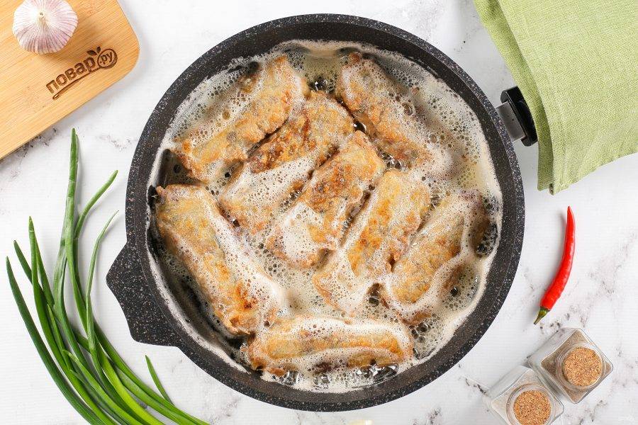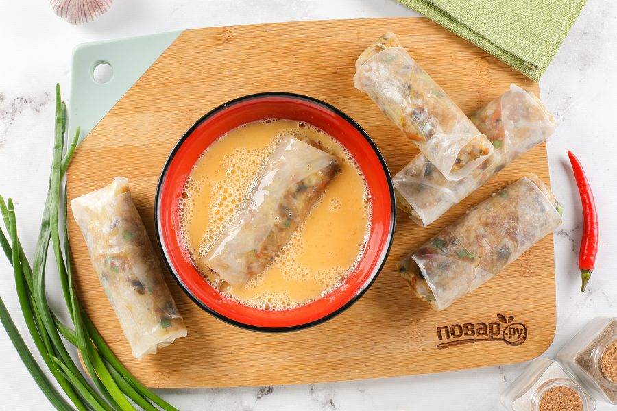 Взбейте яйцо с добавлением соли и перца. Поочерёдно окуните каждый ролл и обжарьте в хорошо разогретой сковороде.