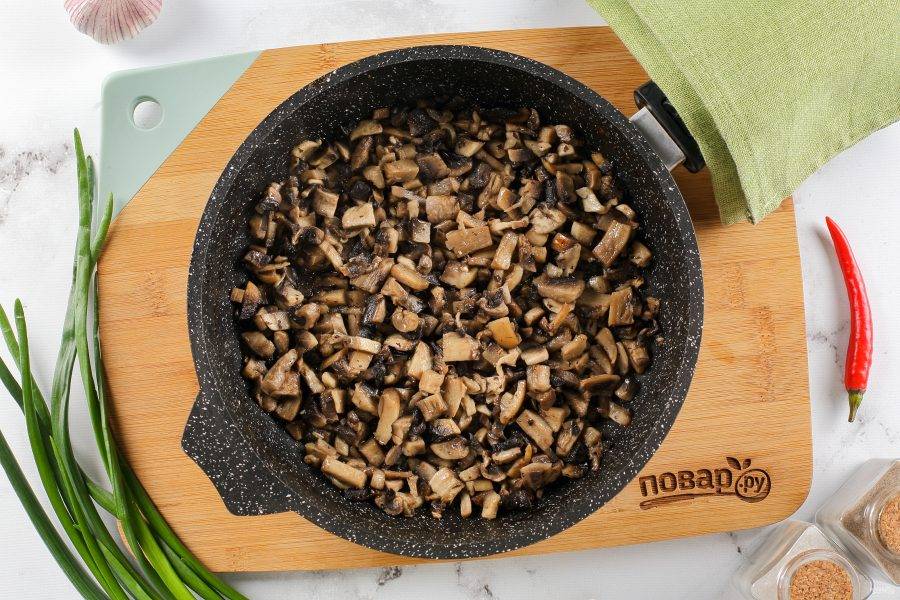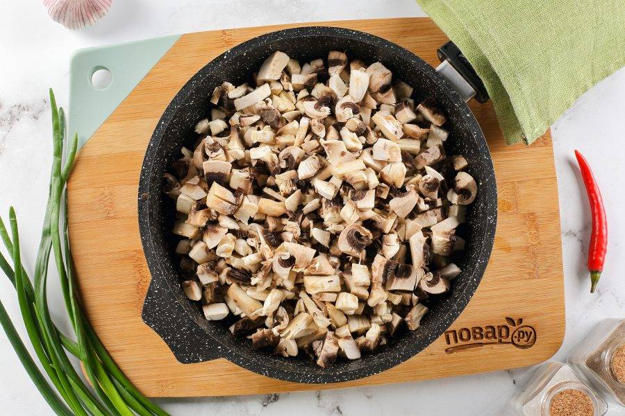 В сковороде разогрейте масло и выложите нарезанные шампиньоны.