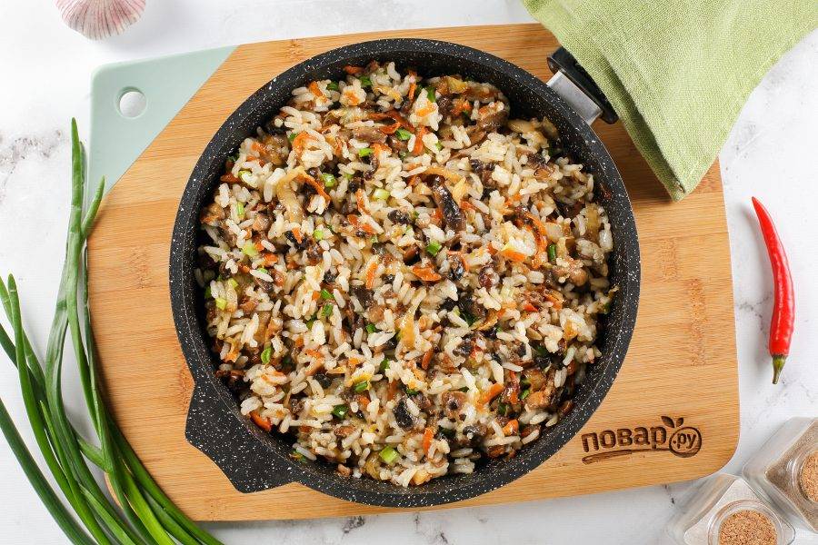 Тушите всё вместе ещё пару минут. Затем снимите с огня, добавьте рис и измельчённый зелёный лук.
