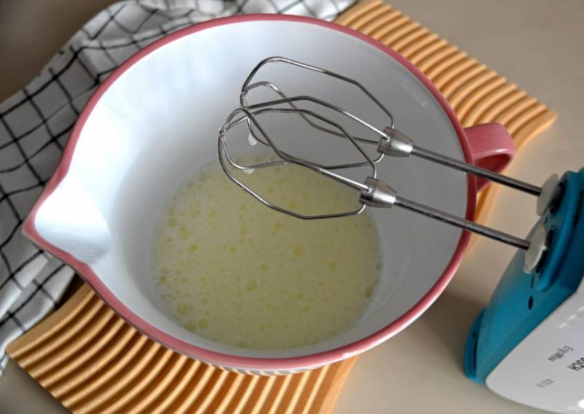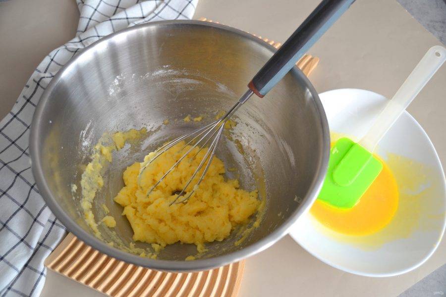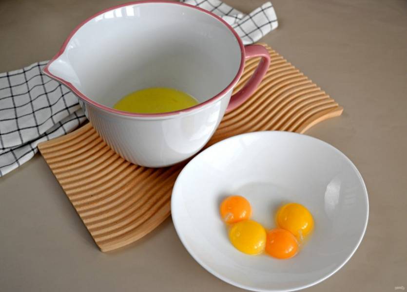 Отделите белки и желтки четырех яиц. Белки сразу вливайте в миску для взбивания. Желтки смешайте вилкой или венчиком в однородную массу.