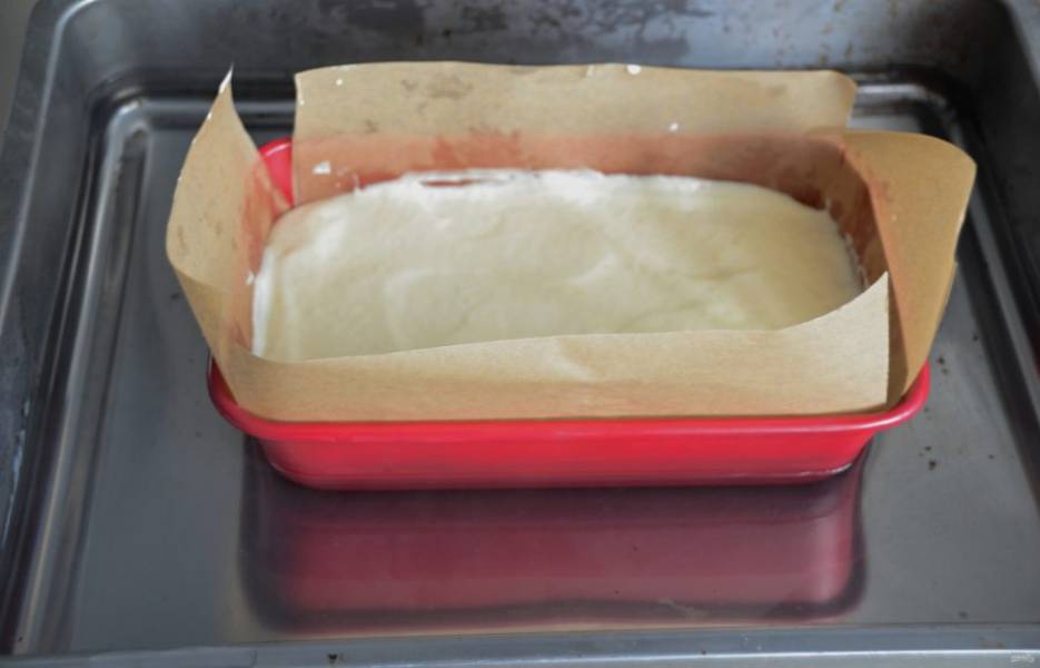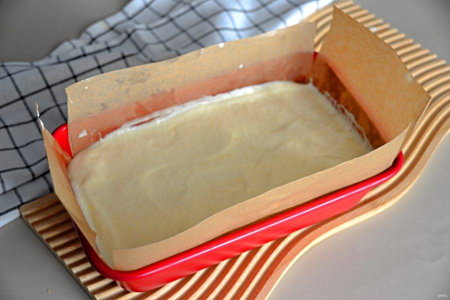 Выложите тесто в подготовленную формочку для выпечки, разровняйте поверхность.