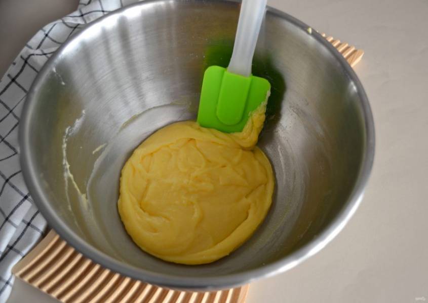 Медленно вливайте горячее молоко с маслом в мучную смесь и смешивайте до однородной массы. Затем частями вливайте и вмешивайте в эту смесь яичные желтки.
