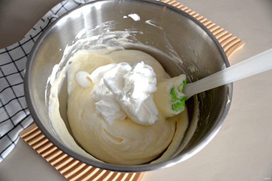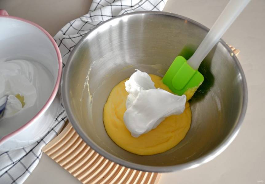 В несколько приемов добавьте белковую массу к мучной, вмешивайте белки силиконовой лопаткой, движением "снизу вверх", стараясь сохранить пышную структуру.