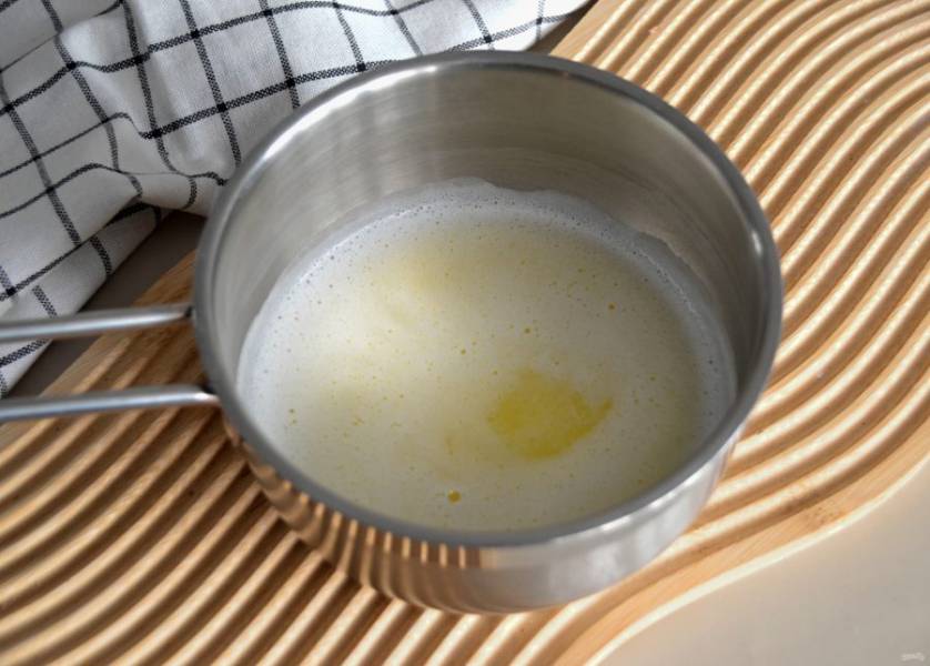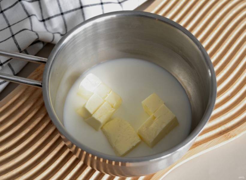 В ковш влейте молоко, добавьте масло, нарезанное кусочками, нагрейте на среднем огне, чтобы масло растопилось, не кипятите.