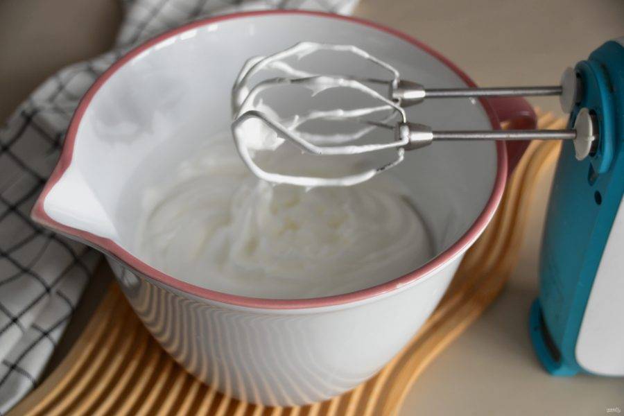 Продолжая взбивать, всыпайте сахарный песок. Взбивайте 3-4 минуты в плотную белковую массу.