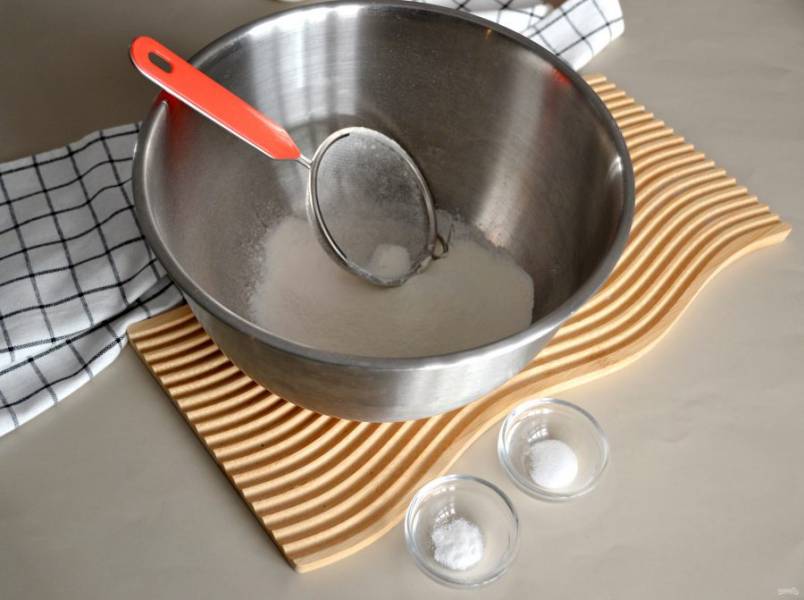 В миску для замешивания теста просейте муку, добавьте соль, ванилин, смешайте.