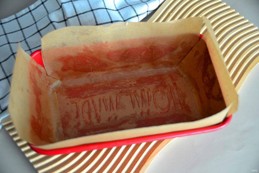 Сразу подготовьте металлическую форму для выпечки, застелите ее бумагой для выпечки. Чтобы бумага хорошо держалась за стенки формы, смажьте их сливочным маслом. Поставьте духовку на разогрев в режиме "верх-низ" на 150 градусов.