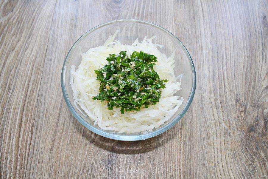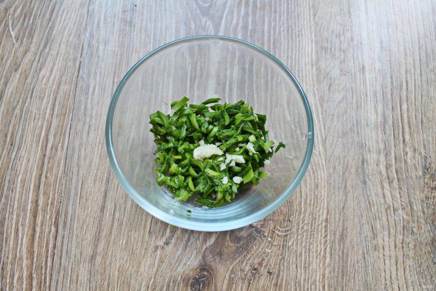 Зеленый лук мелко порежьте, добавьте к нему измельченный чеснок.