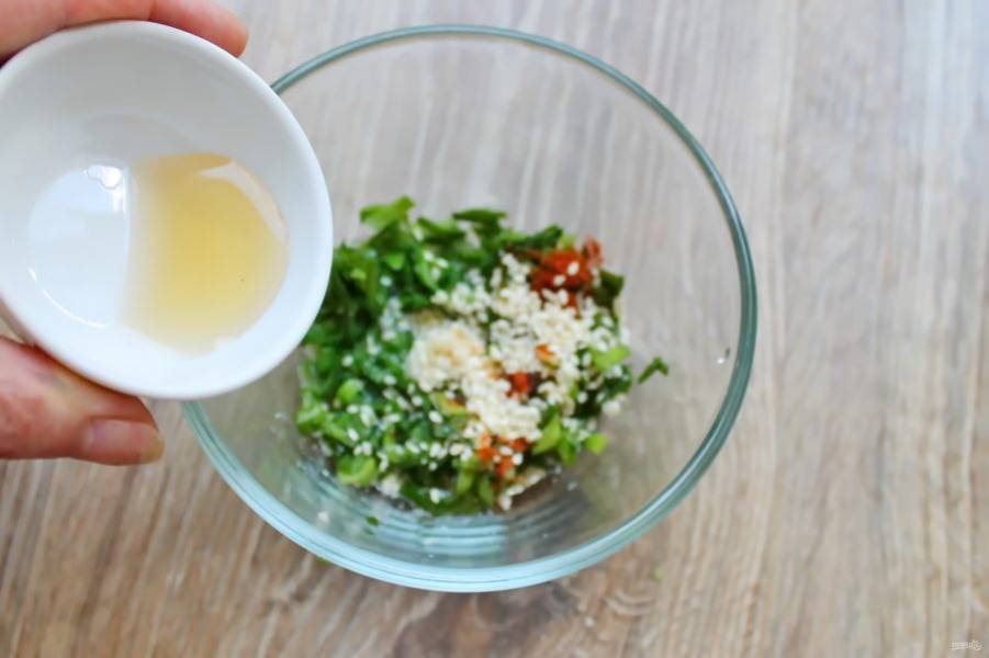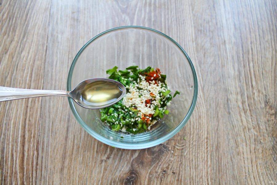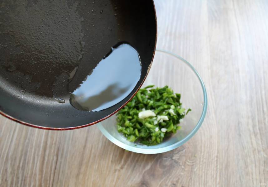 Растительное масло очень сильно разогрейте и влейте в миску с луком и чесноком.