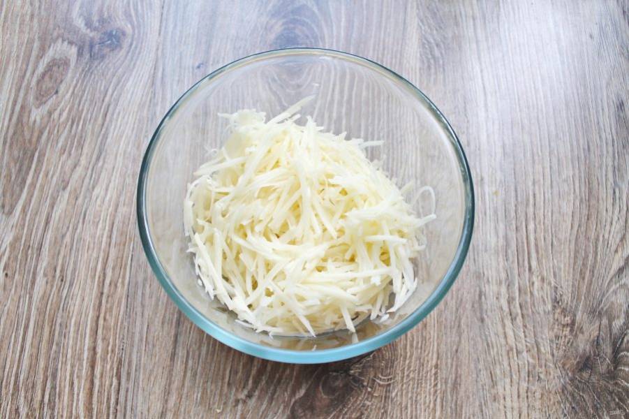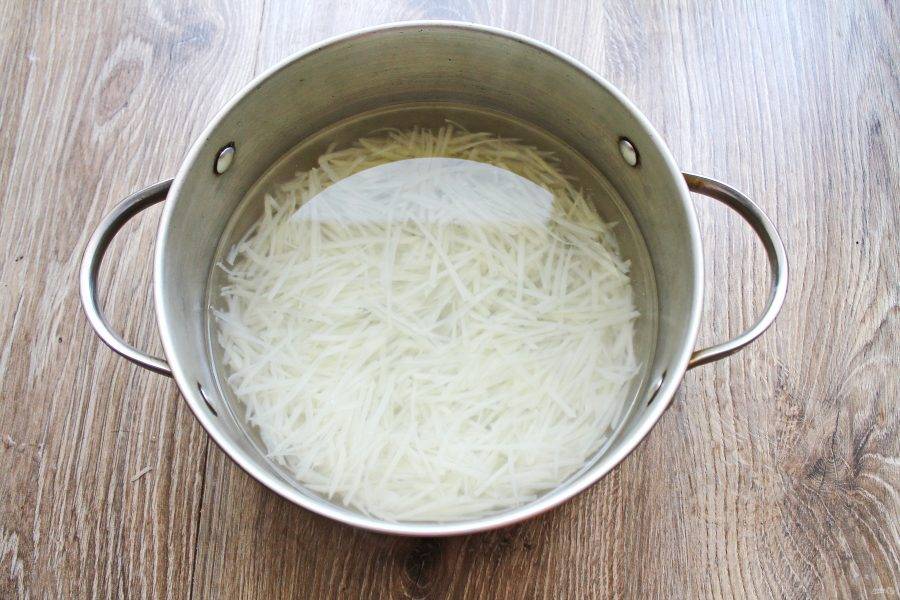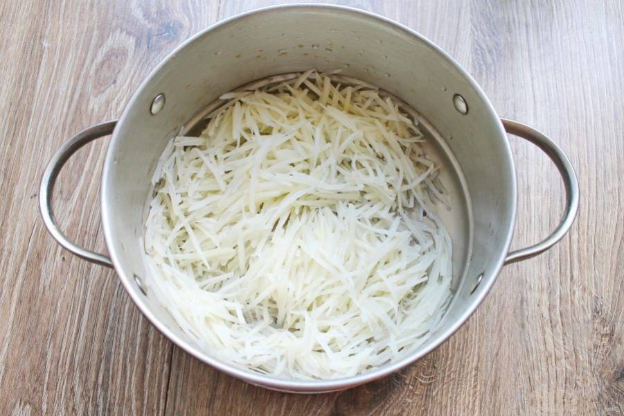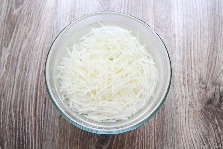 Картофель почистите и вымойте. Натрите на корейской терке и промойте под проточной, холодной водой до прозрачности.
