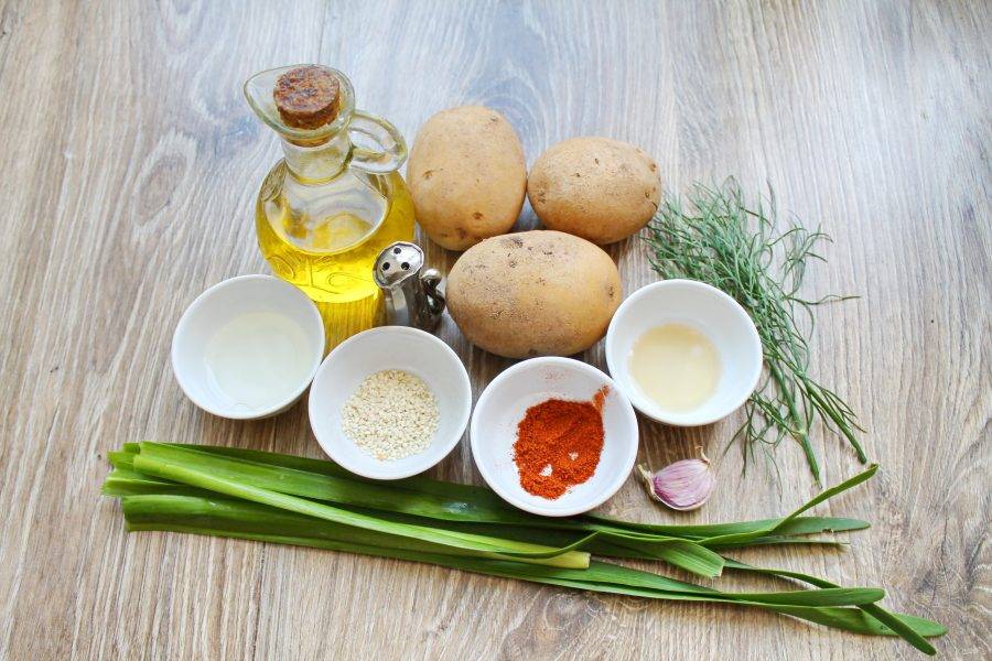 Подготовьте все необходимые ингредиенты для приготовления китайского картофельного салата.