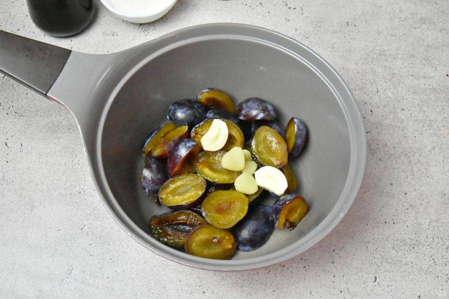 Сливы помойте, просушите, разрежьте пополам и освободите от косточки. Выложите плоды в подходящего размера посуду с толстым дном. Туда же добавьте очищенные зубчики чеснока и кусочки имбиря.