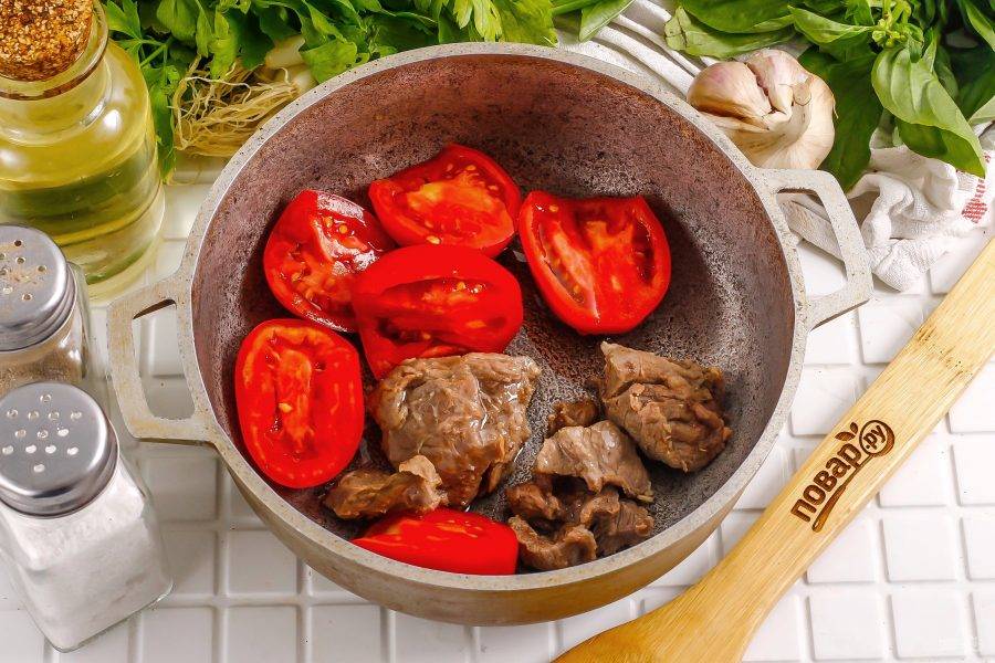 Промойте помидоры в воде и разрежьте их пополам. Срежьте зеленые сердцевинки. Лучше использовать небольшие плоды. Мясо нарежьте на части, прогрейте в казане растительное масло. Выложите в него половинки помидоров и нарезку мяса.