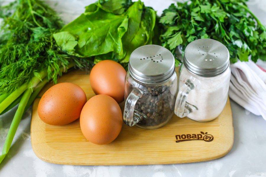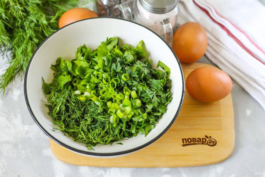 Промойте зелень. Обсушите с помощью бумажного полотенца и мелко нарежьте. Шпинат нарежьте мелкими полосками.