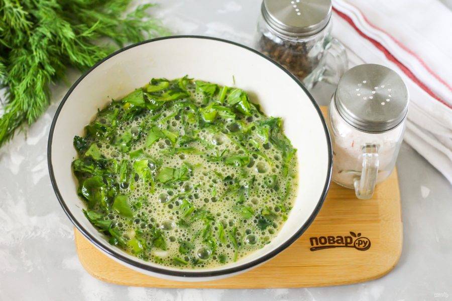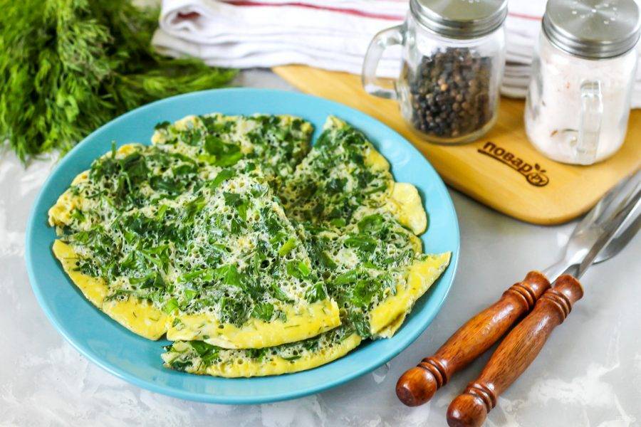 Прогрейте сковороду на плите, включая максимальный нагрев. Влейте на нее растительное масло и уменьшите нагрев до минимального. Вылейте яичную смесь с зеленью на сковороду, разровняйте.