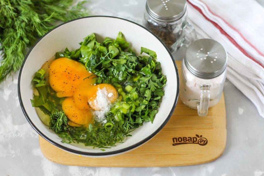 Вбейте в емкость куриные яйца, лучше всего использовать яйца от домашней птицы - в них яркие желтки. Посолите и поперчите.