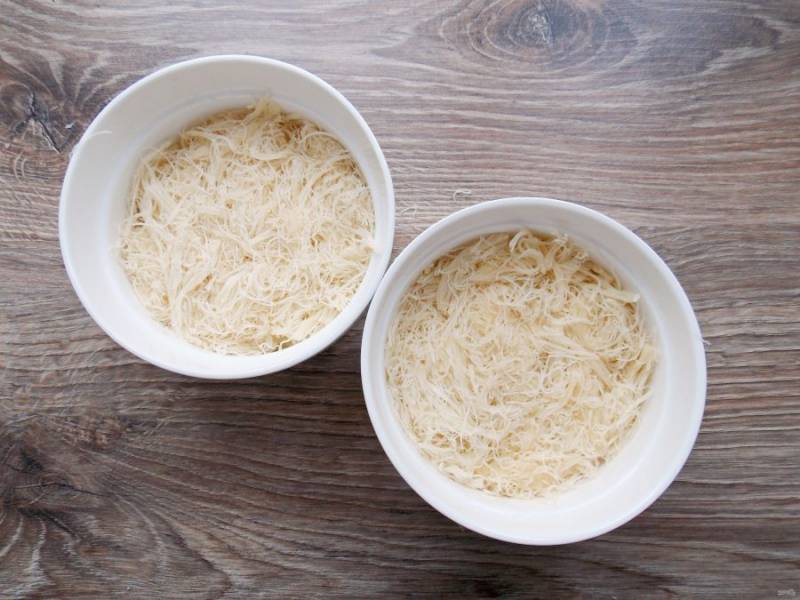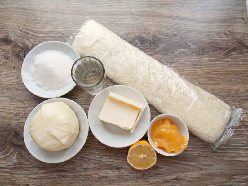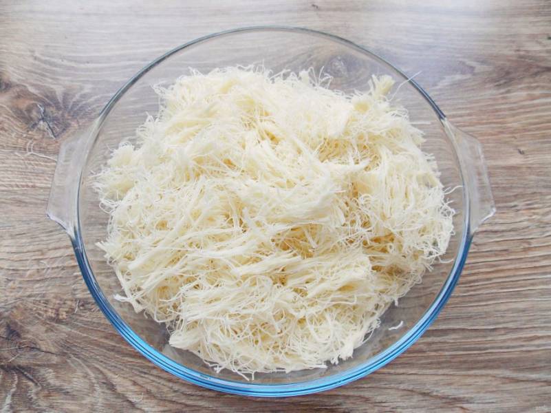Подготовьте все необходимые ингредиенты для приготовления десерта Кюнефе. Тесто извлеките из морозилки и разморозите при комнатной температуре.