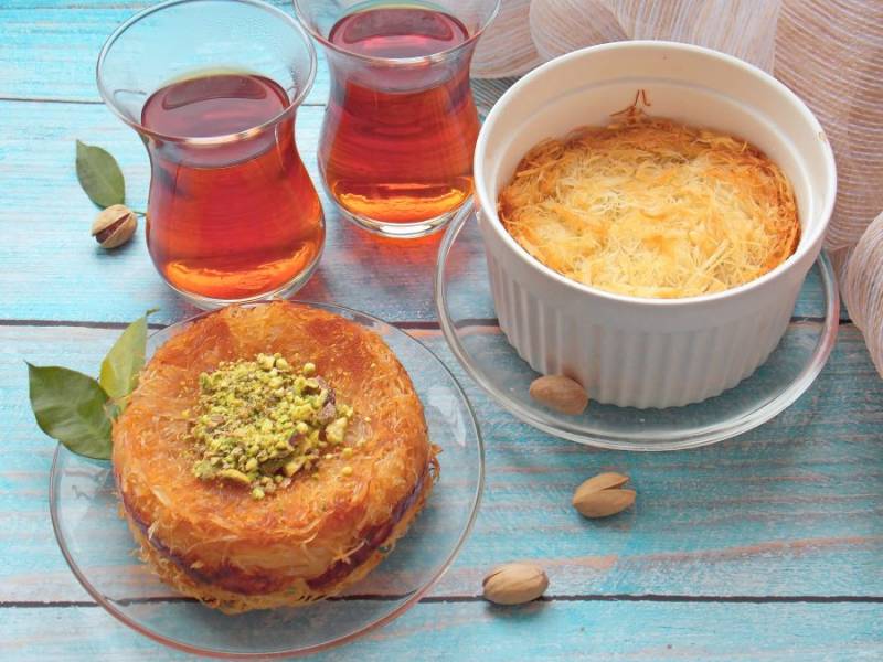 Дайте постоять 5 минут и переверните на блюдо. Украсьте Кюнефе молотыми фисташками и подавайте к столу. Приятного чаепития!