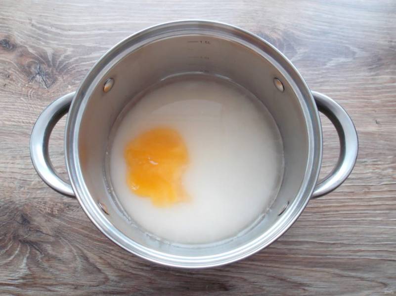 Для начала сварите сироп. В кастрюлю всыпьте сахар, добавьте мед, влейте воду и лимонный сок.