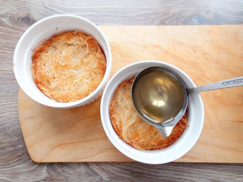 Извлеките формы из духовки и сразу немного полейте сиропом. Дайте постоять 2-3 минуты и полейте снова.