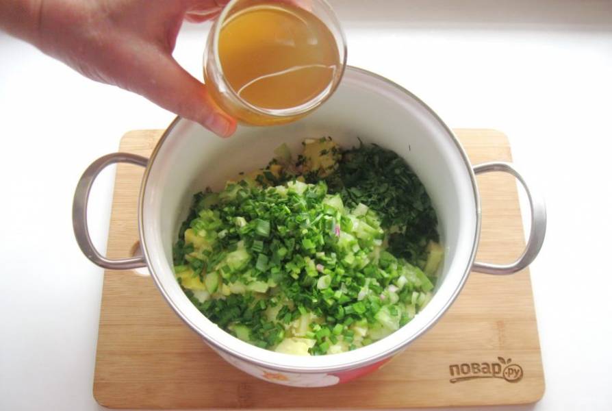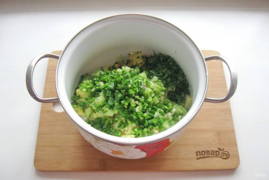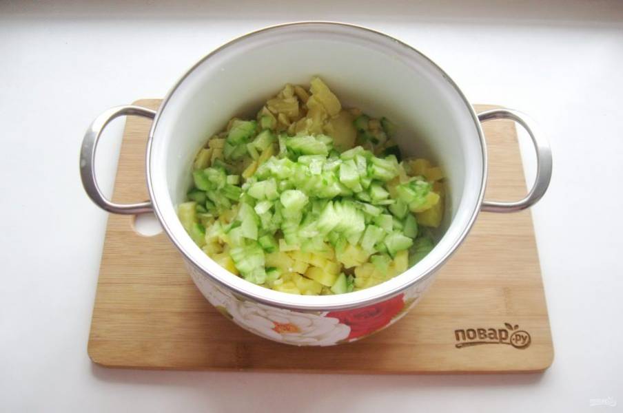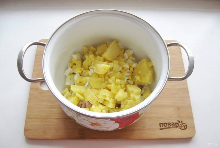 Картофель сварите, охладите и мелко нарежьте. Добавьте в кастрюлю.