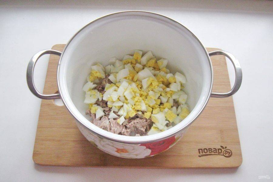 Яйца сварите вкрутую, охладите и мелко нарежьте.