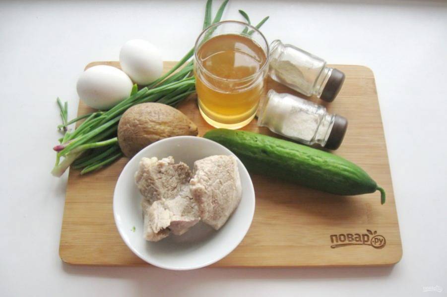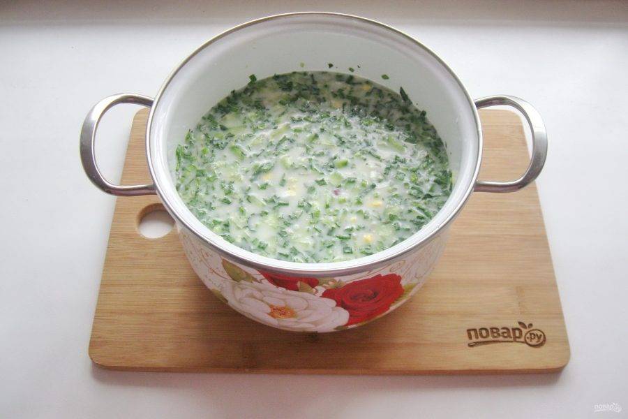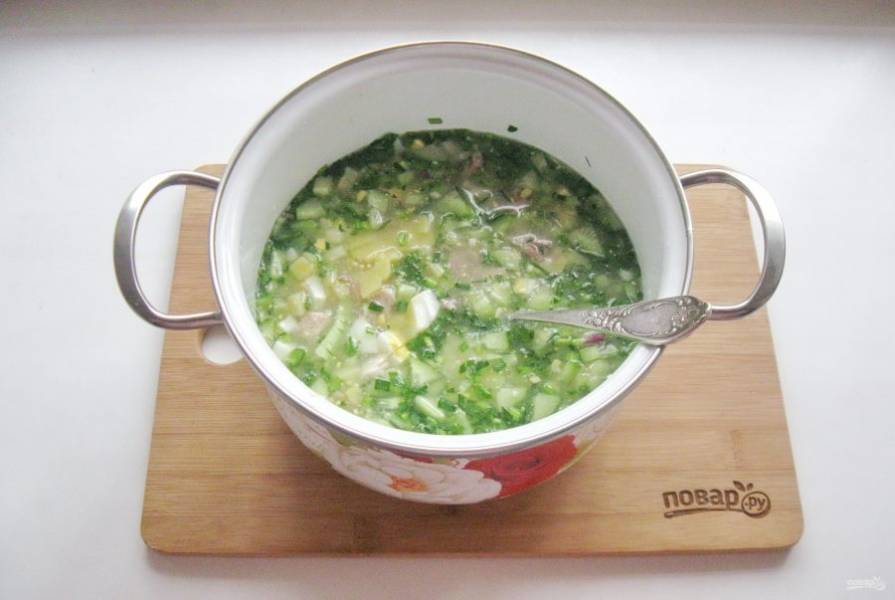 Классическая окрошка с мясом готова. Подавайте на первое в обед.