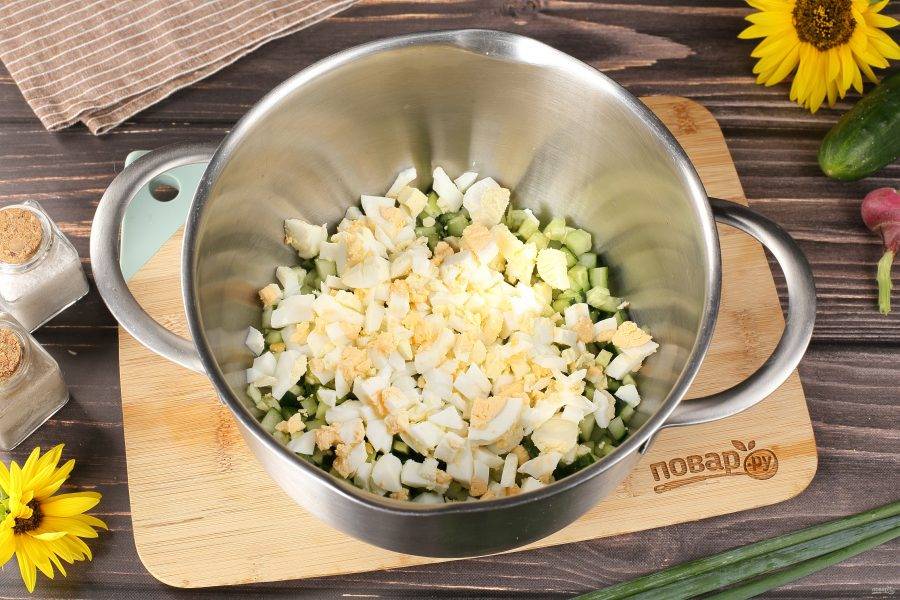 Добавьте нарезанные кубиками варёные яйца.