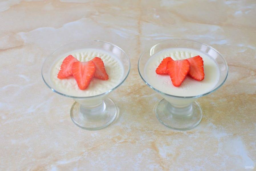 Готовый застывший десерт украсьте свежими ягодами.