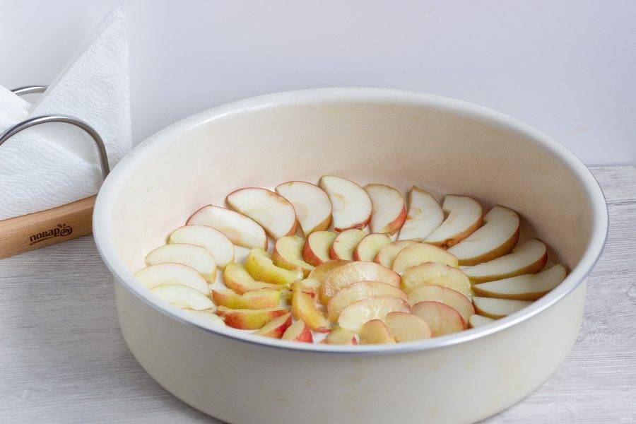 Форму для запекания смажьте растительным маслом. По большому кругу выложите дольки яблок, а по центру - нектарины. Посыпьте фрукты сахаром для образования вкусной корочки.