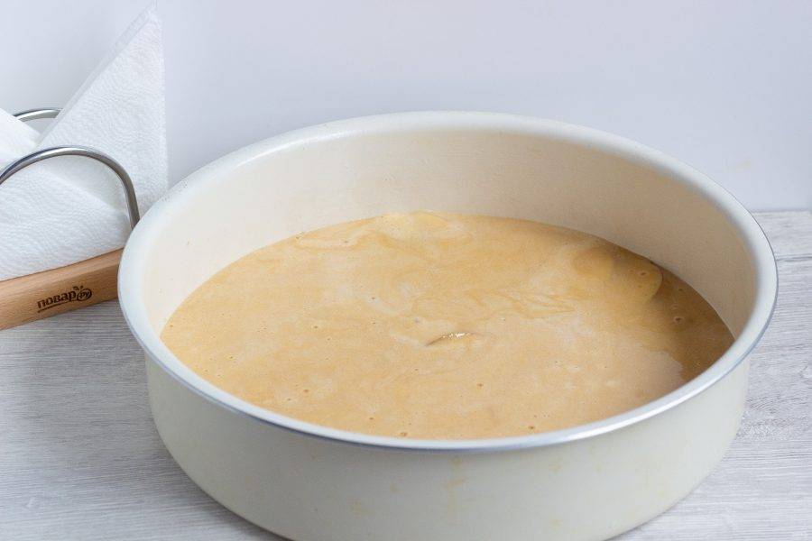 Залейте фрукты тестом и отправьте в разогретую до 180 градусов духовку на 40-50 минут.