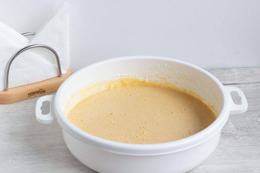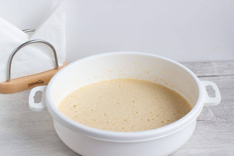 Яйца немного взбейте миксером. Добавьте сметану, сахар, соль и ванильный сахар, взбивайте в течение 5-6 минут до растворения сахара.