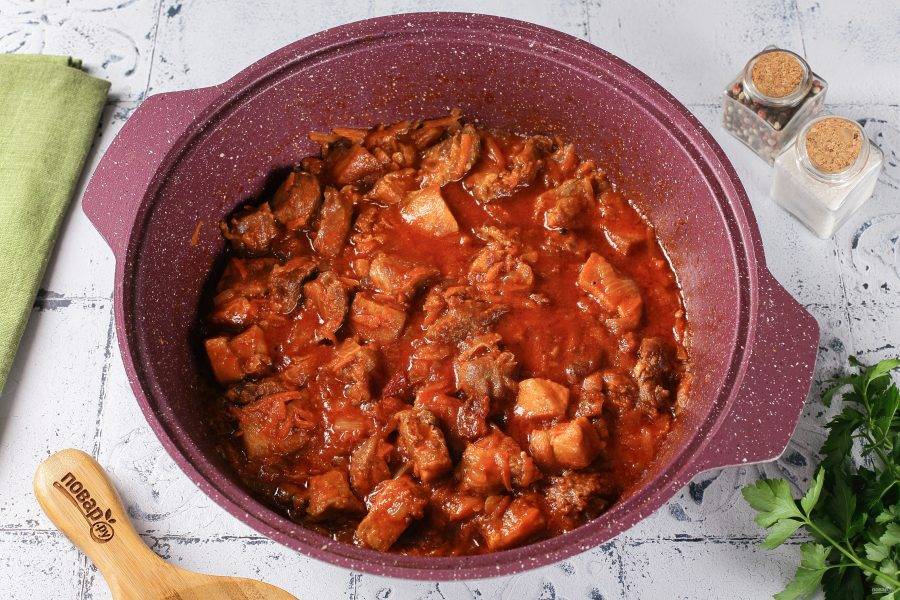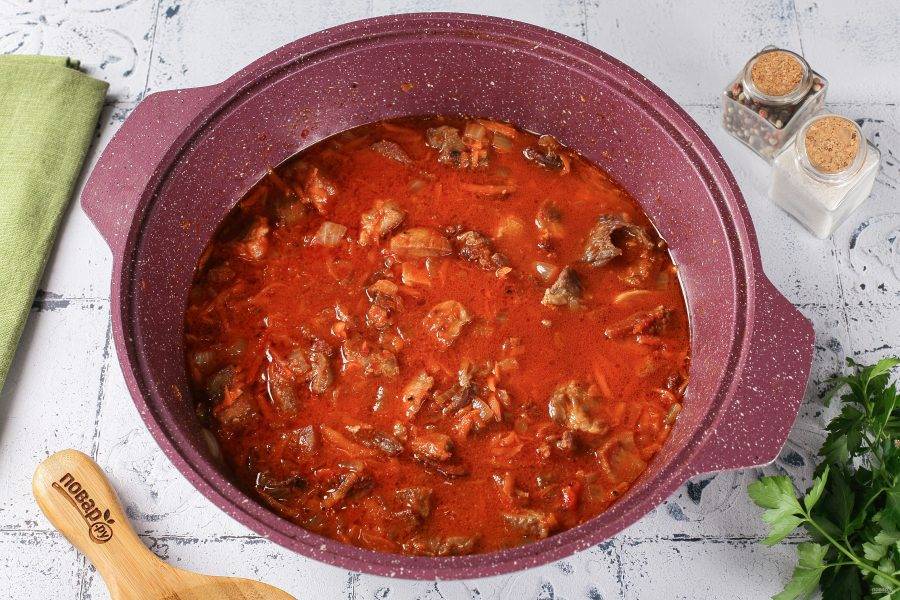 Добавьте томатную пасту и продолжайте готовить ещё 1-2 минуты.