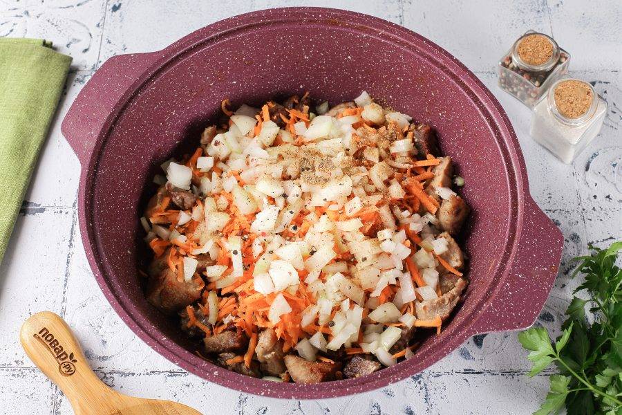 Обжарьте мясо на среднем огне до испарения жидкости и лёгкого румянца. Добавьте тёртую морковь, нарезанный кубиками лук, соль и специи по вкусу.