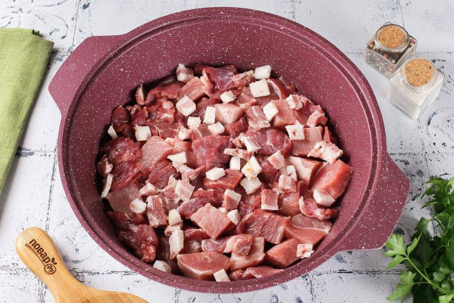Мясо, бекон или грудинку нарежьте кубиками. Выложите в разогретую сковороду с маслом. Можно использовать любую посуду с толстым дном, сотейник или казан.